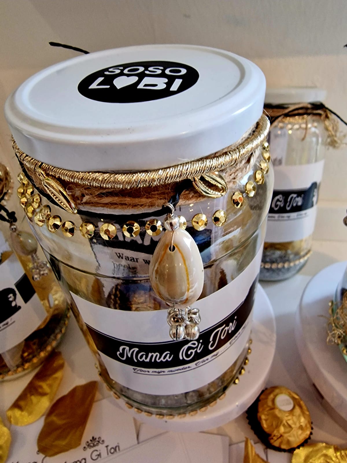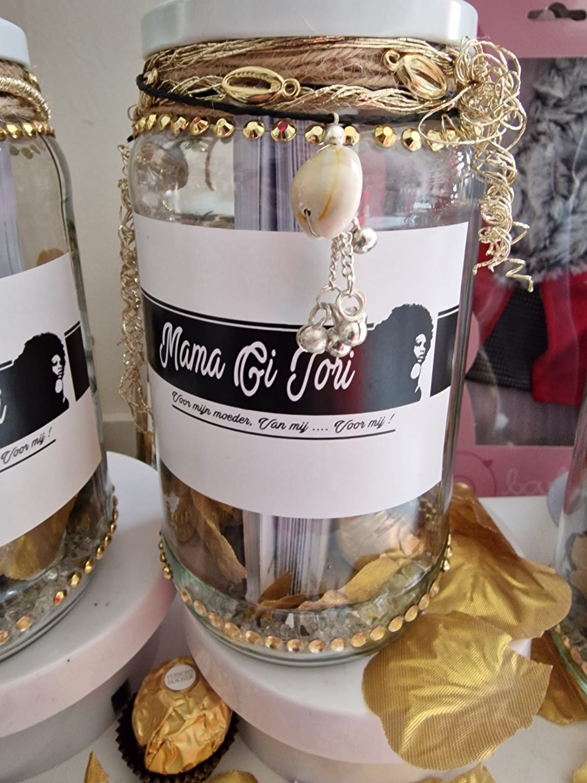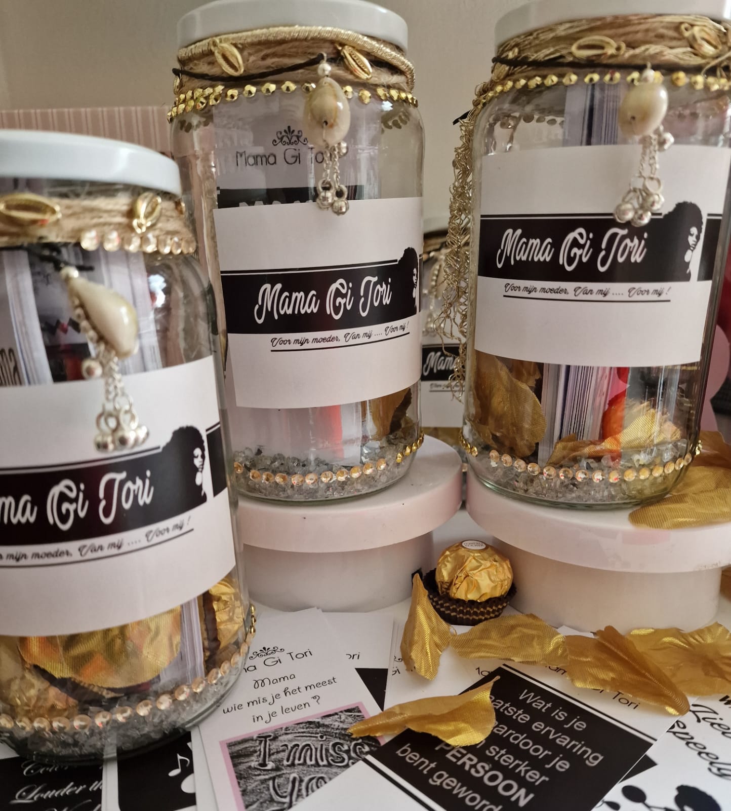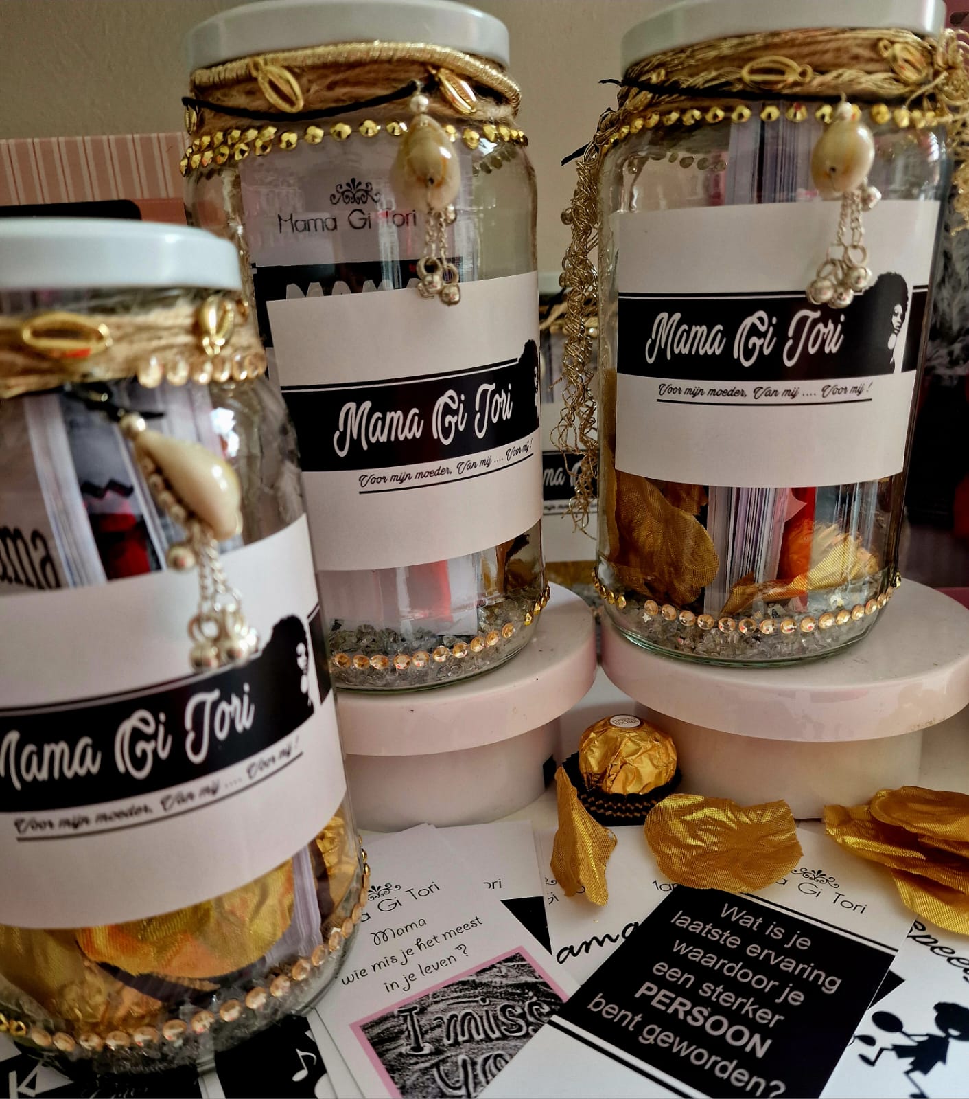 A beautiful glass jar with 50 cards, on which there are various questions that you want to know from your mother. (written in Dutch)