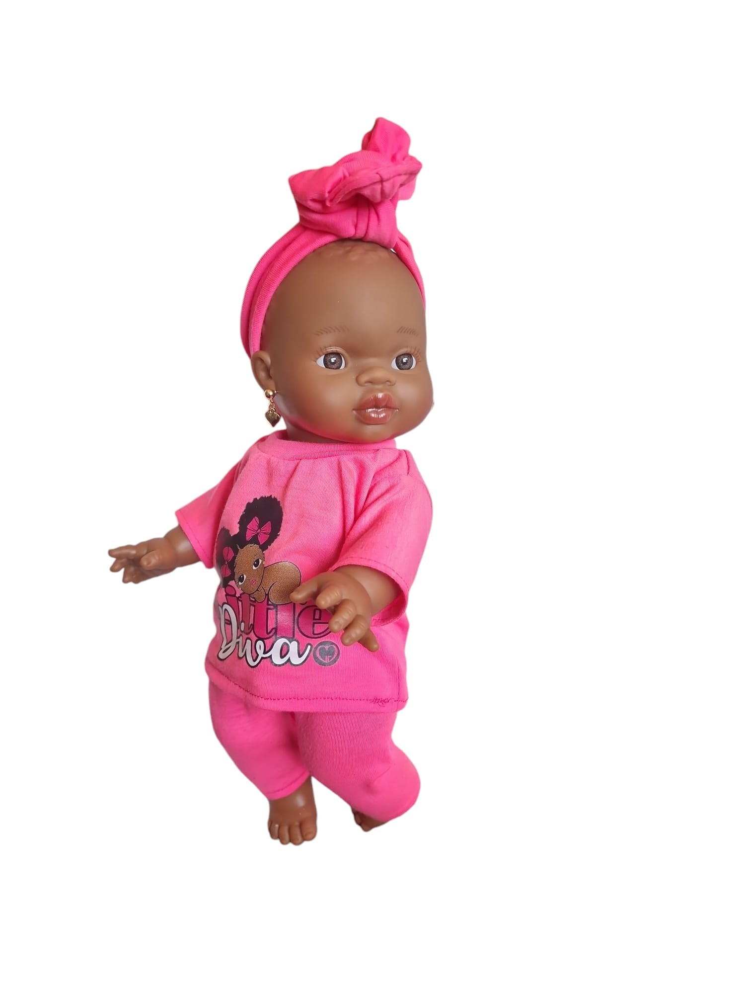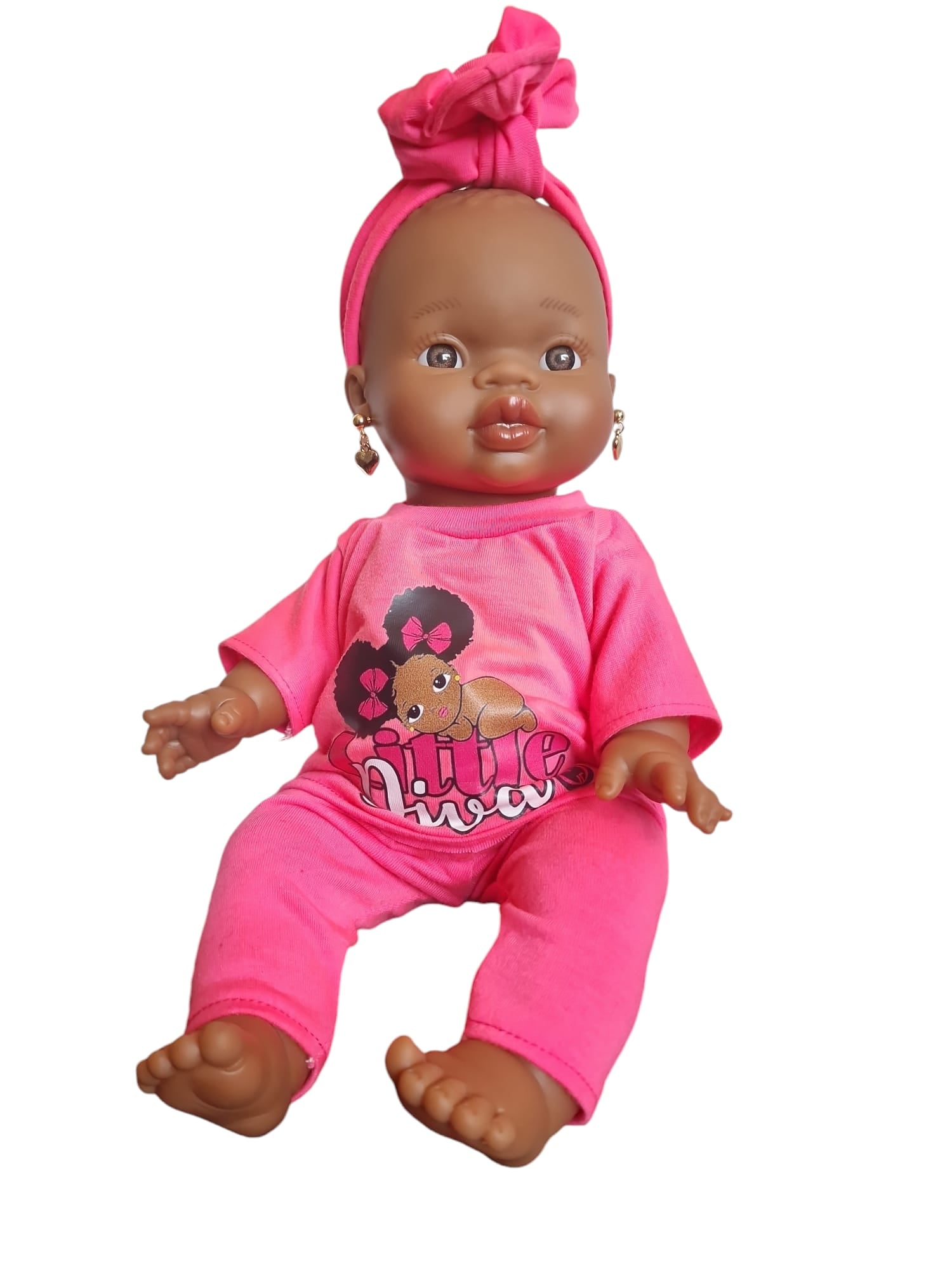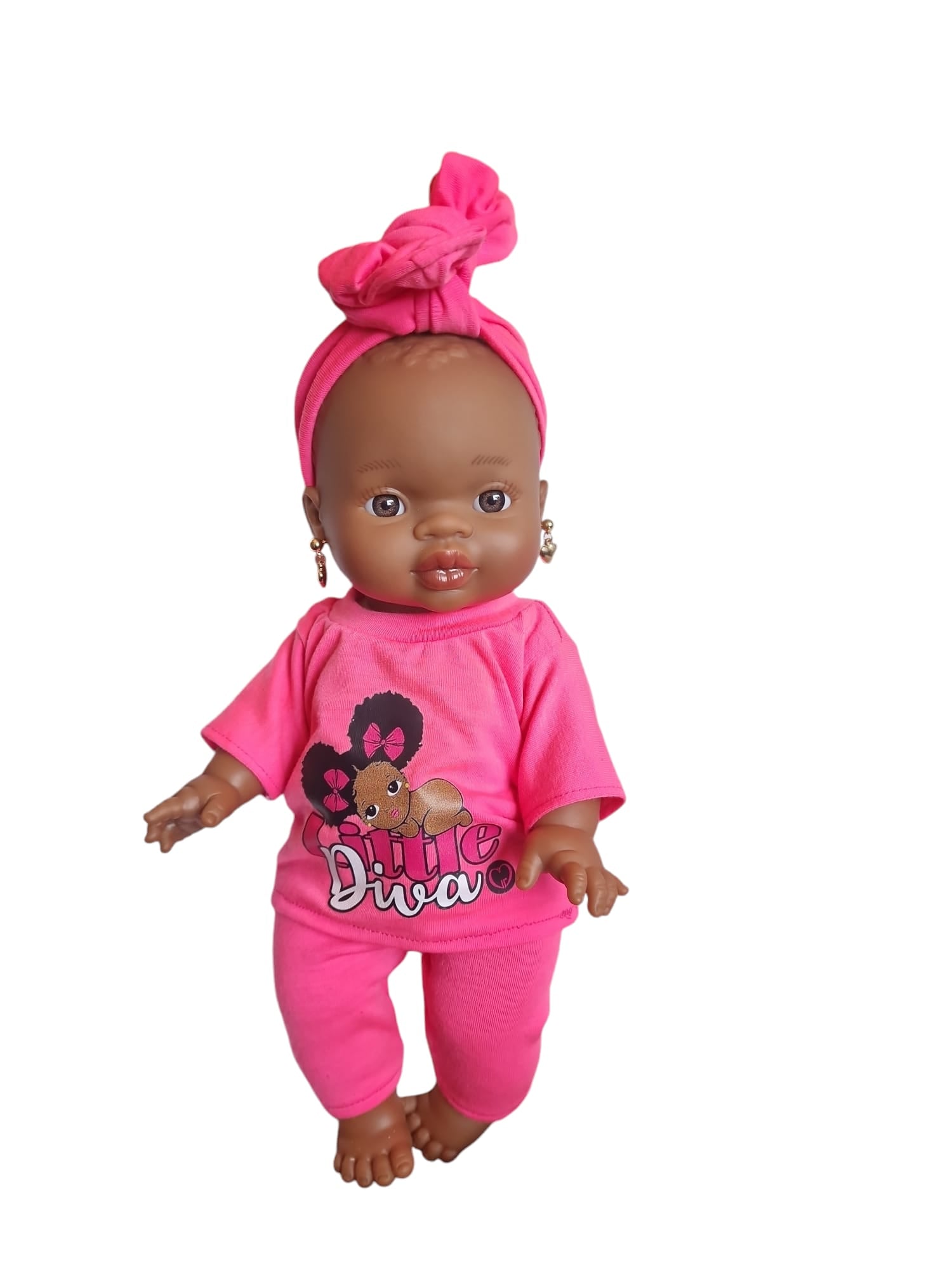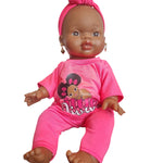 Ontmoet Selah, onze prachtige, kale pop. Selah heeft een fantastisch pakje aan met kleurrijke patronen. Little Diva...Daarnaast draagt ze een haarband...Word jij Selah's nieuwe speelmaatje? Shop haar vandaag nog en geniet van haar vrolijke, kleurrijke uitstraling.