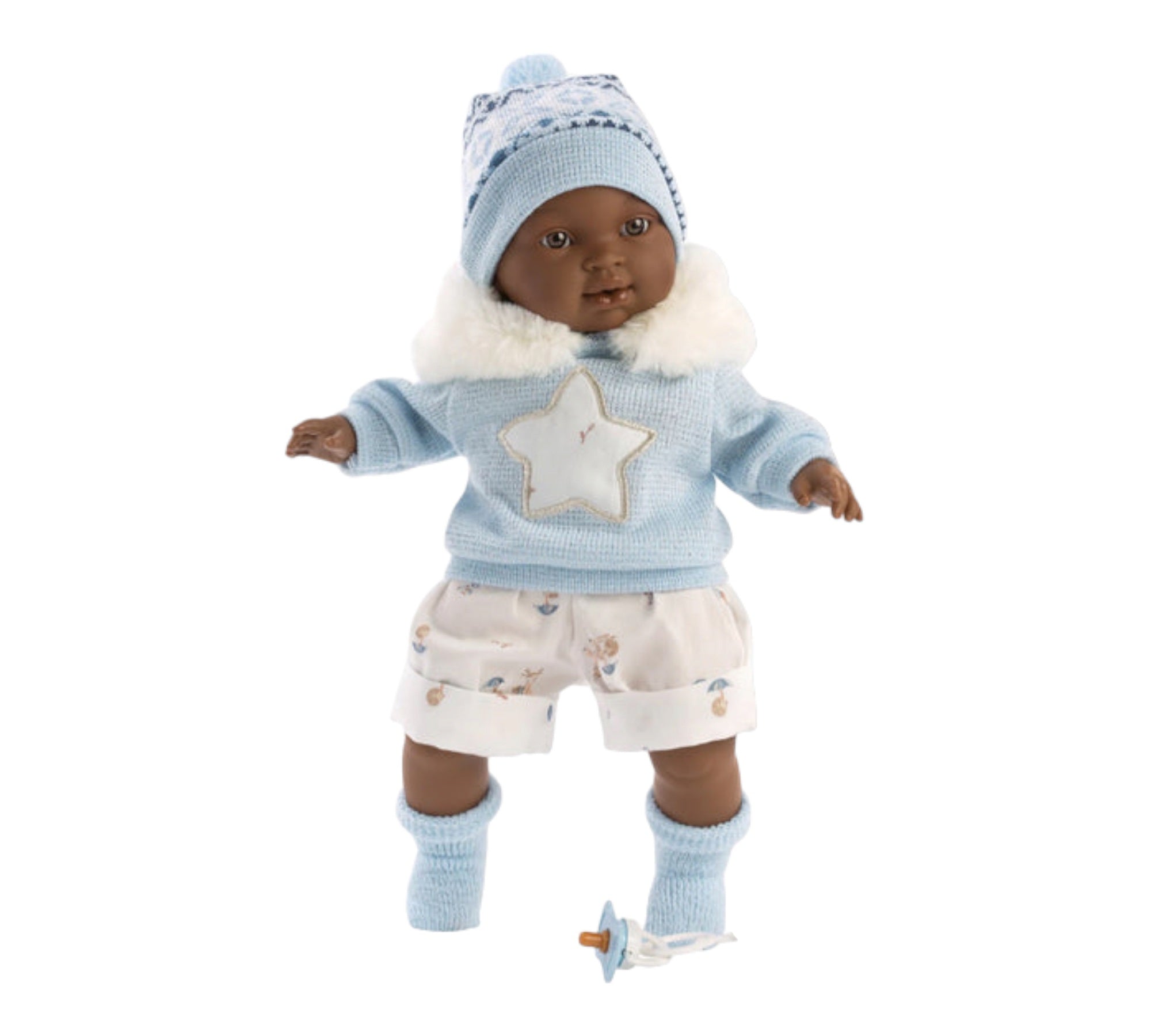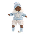 Prachtig gekleed met een blauwe trui met bontcapuchon,