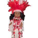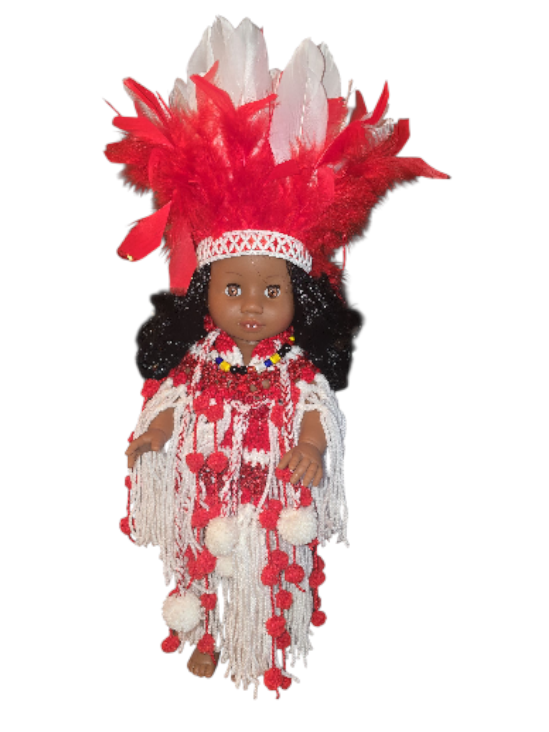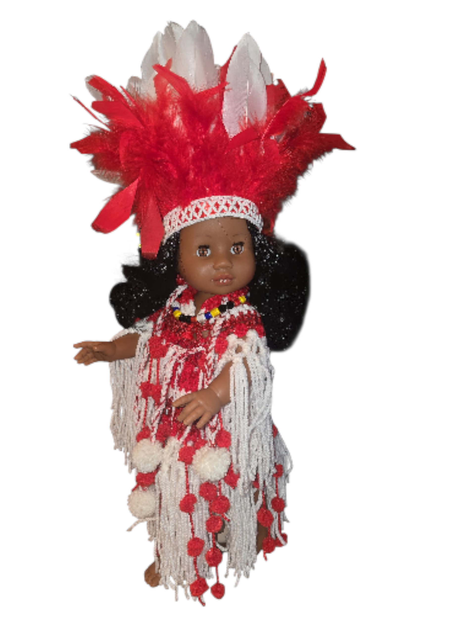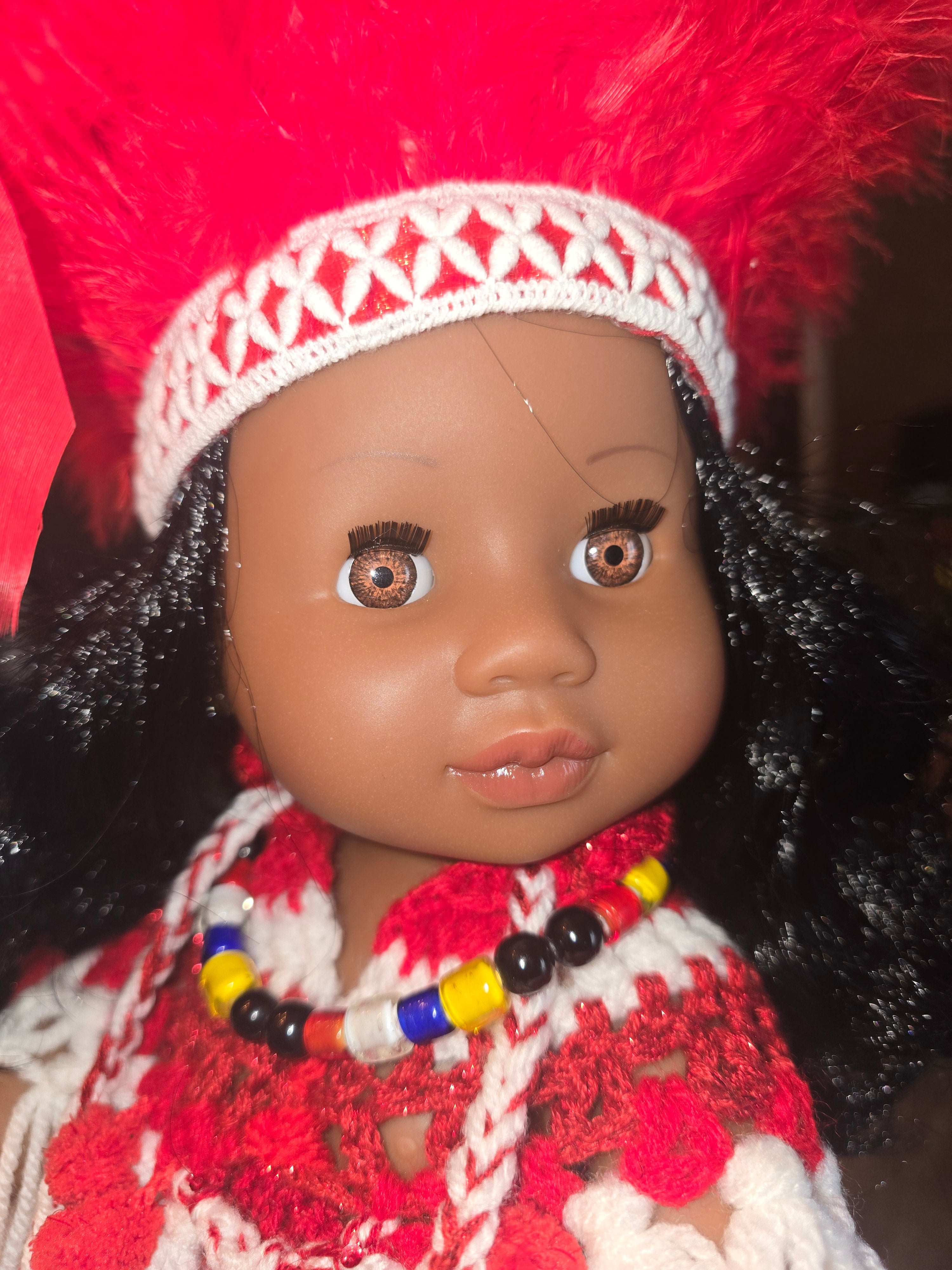 Deze pop is een cultureel geïnspireerde creatie Quinty is haar naam....Haa hand gehaakte poppoentjes klederdracht is een lust voor t oog...een dracht waarin zij elementen van de inheemse volken van Suriname laat terugkomen. Quinty draagt traditionele kledij en accessoires zoals de Ingi Boka ketting van echte glaskralen die verwijzen naar de cultuur, levensstijl en erfgoed van de inheemse gemeenschappen, zoals onder andere de Kari’na (Carib), Lokono (Arowak), Trio en Wayana.